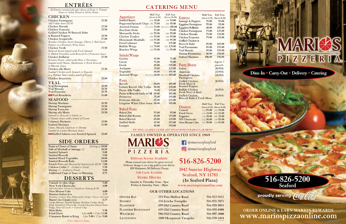 Welcome to Mario's Pizzeria of Seaford, a culinary gem nestled at 3842 Sunrise Hwy, Seaford, NY. Renowned for its authentic Italian cuisine, this pizzeria offers a menu that reflects both tradition and flavor. Customers rave about the buffalo chicken pizza, considered the best on Long Island, and the pasta, which is celebrated for its quality and taste.